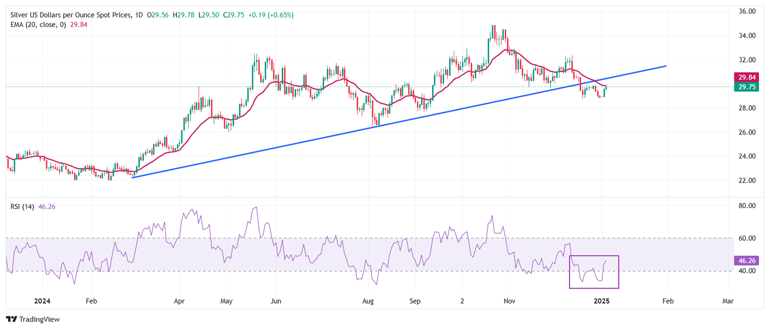 El precio de la Plata rebota hasta cerca de la media móvil exponencial (EMA) de 20 días, que se negocia alrededor de 29.85$. Sin embargo, la perspectiva del metal blanco sigue siendo bajista mientras se mantenga por debajo de la línea de tendencia ascendente, que se traza desde el mínimo del 29 de febrero en 22.30$ en un marco de tiempo diario.