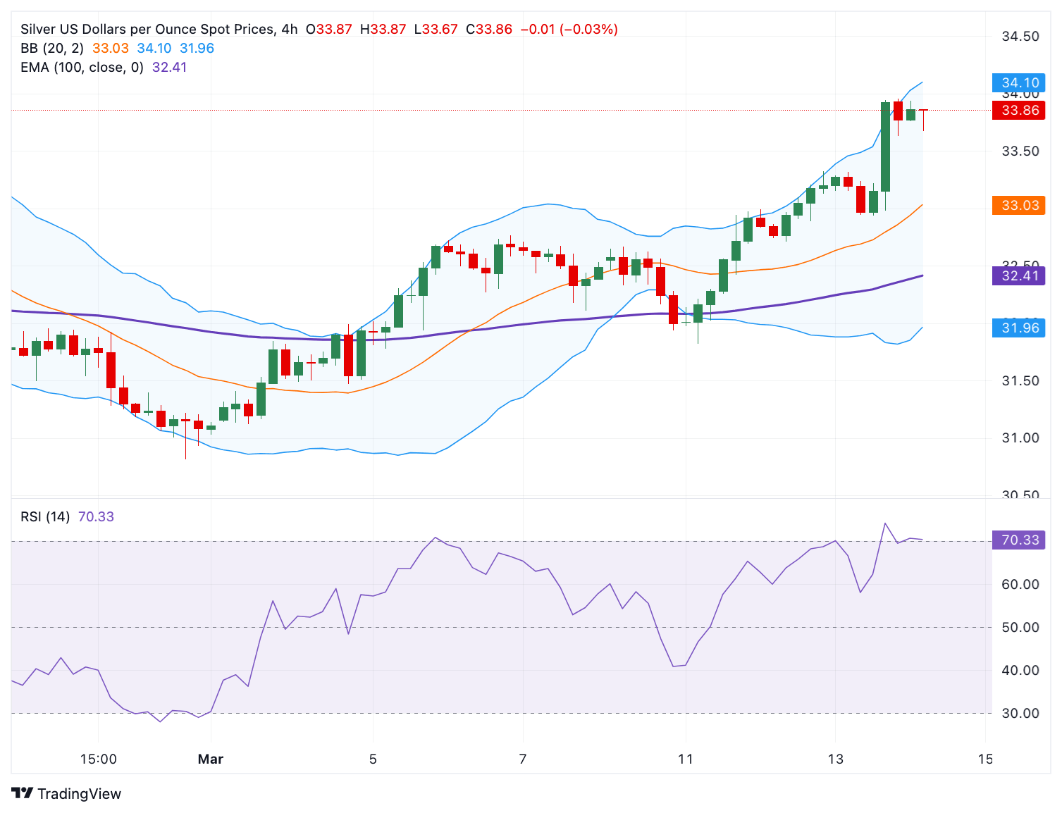 Plata Análisis del Precio: XAG/USD mantiene la vibra alcista por encima de 33.50$ a medida que la guerra comercial se intensifica