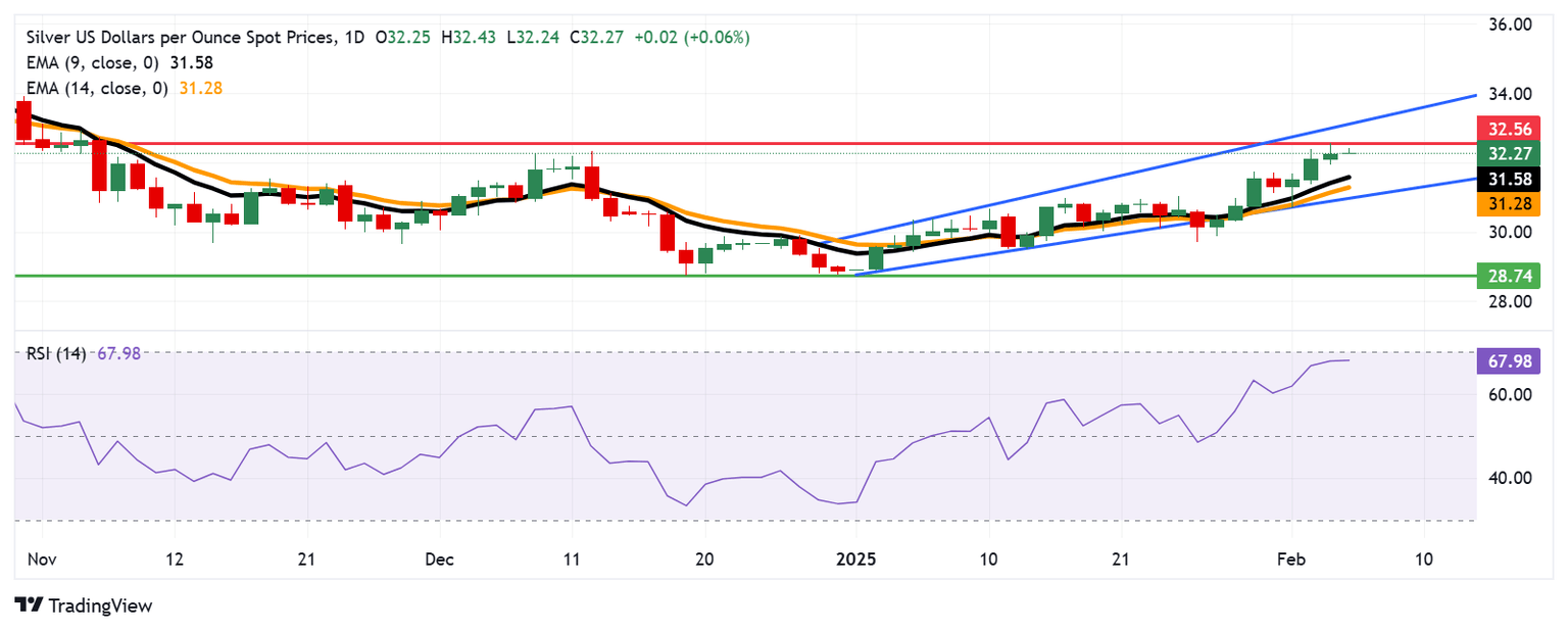 El par XAG/USD se mantiene por encima de las medias móviles exponenciales (EMAs) de nueve y 14 días, lo que indica un sólido impulso a corto plazo. Además, el índice de fuerza relativa (RSI) de 14 días se está acercando al nivel de 70, reforzando el sentimiento alcista. Una ruptura por encima de la marca de 70 podría señalar condiciones de sobrecompra, lo que potencialmente llevaría a una corrección a la baja.
