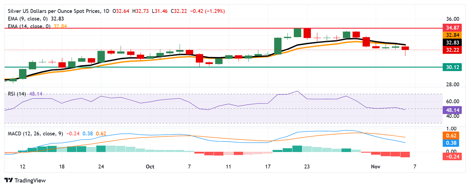 Plata Análisis del Precio: XAG/USD opera por debajo de 32,50$, EMA de nueve días