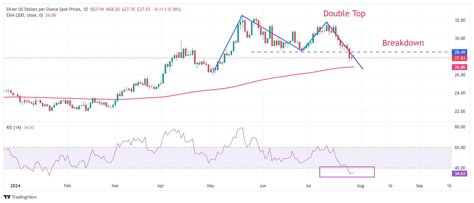 El precio de la Plata se debilita tras una ruptura de la formación de Doble Techo por debajo del mínimo del 26 de junio cerca de 28.60$ en un marco temporal diario. Un quiebre a la baja del patrón de gráfico mencionado resulta en un cruce bajista. Se espera que el precio de la Plata encuentre un colchón temporal cerca de la media móvil exponencial (EMA) de 200 días, que cotiza alrededor de 26.86$.