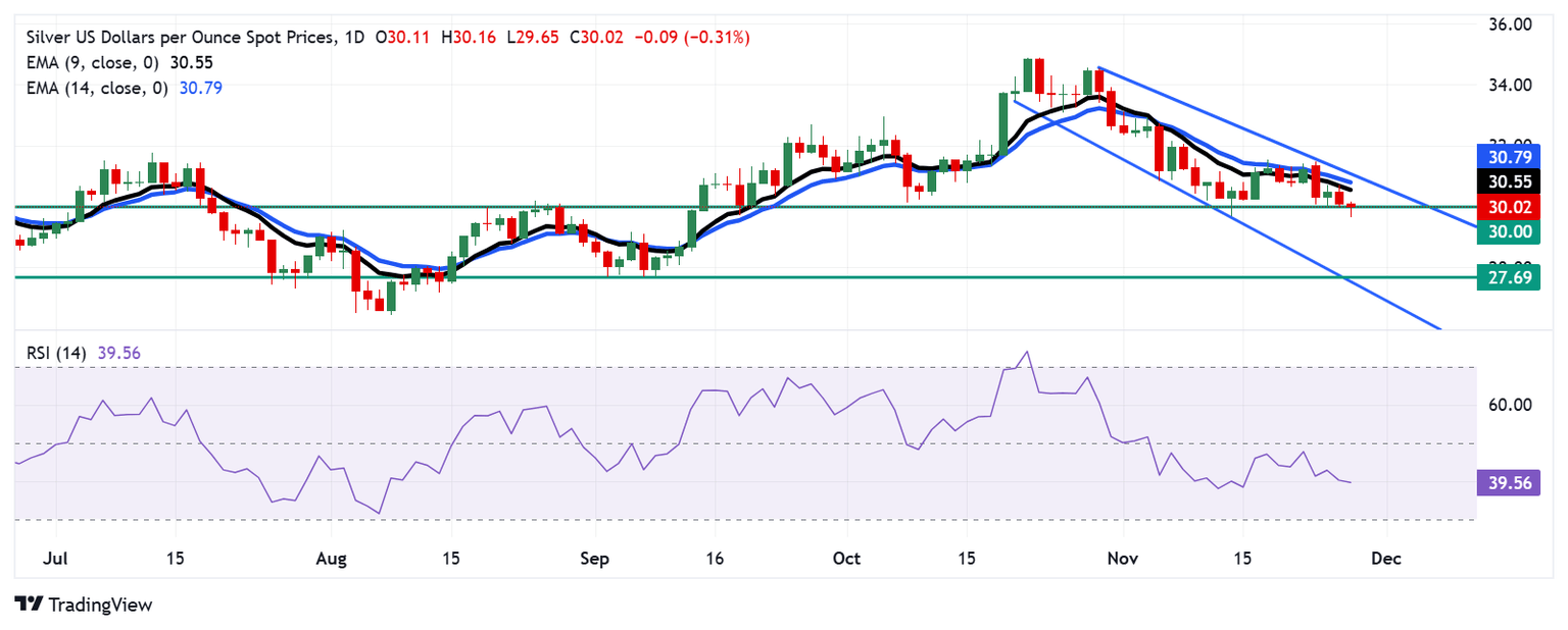 El precio de la Plata (XAG/USD) extiende sus pérdidas por segundo día consecutivo, cotizando alrededor de 30.00$ por onza troy durante las horas europeas del jueves. El análisis del gráfico diario indica una tendencia bajista dominante, con el par consolidándose dentro de un patrón de canal descendente. Además, el Índice de Fuerza Relativa (RSI) de 14 días se mantiene por debajo de la marca de 50, apoyando aún más el sentimiento bajista.