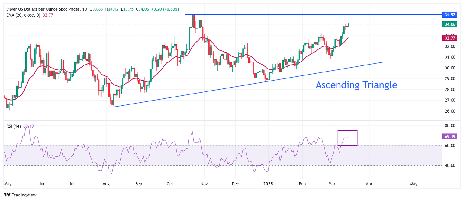 El precio de la Plata (XAG/USD) alcanza un nuevo máximo de cuatro meses cerca de los 34.10$ durante las horas de negociación en Europa el martes. El metal blanco se fortalece a medida que el Dólar estadounidense (USD) disminuye en medio de la creciente incertidumbre sobre las perspectivas económicas de Estados Unidos (EE.UU.) bajo el liderazgo del presidente Donald Trump.