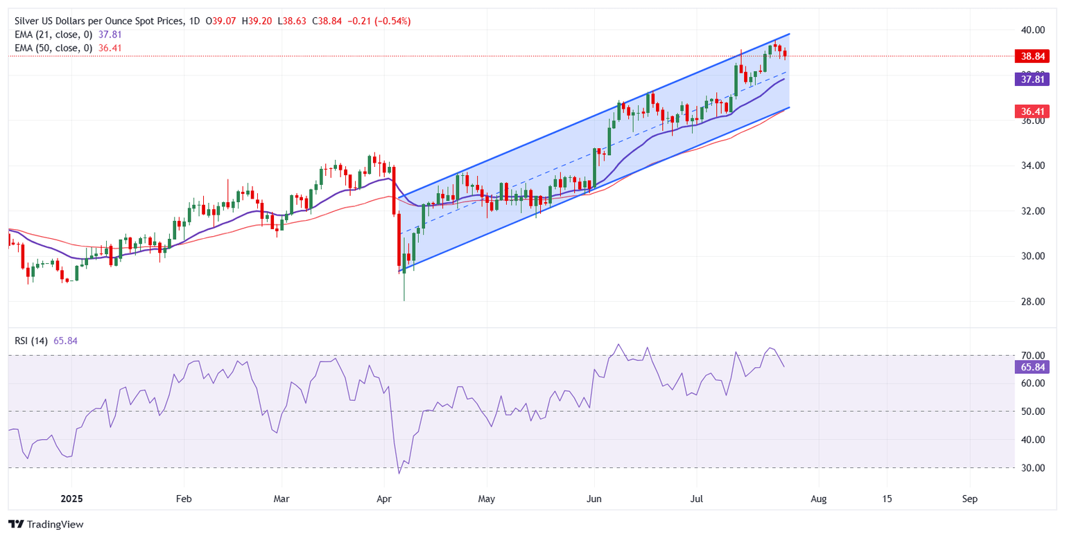 La Plata (XAG/USD) corrige a la baja por tercer día el viernes, suavizándose a alrededor de 38.84$ tras alcanzar un nuevo máximo de 14 años de 39.53$ a principios de semana. El retroceso refleja un sentimiento de riesgo global mejorado y un modesto rebote en el Dólar estadounidense (USD), ya que los datos macroeconómicos optimistas de EE.UU. y las señales de relajación de las tensiones comerciales disminuyen la demanda de refugio seguro. A pesar de la caída, el metal sigue subiendo casi un 1.70% hasta ahora esta semana, subrayando la fuerza de la tendencia alcista más amplia.