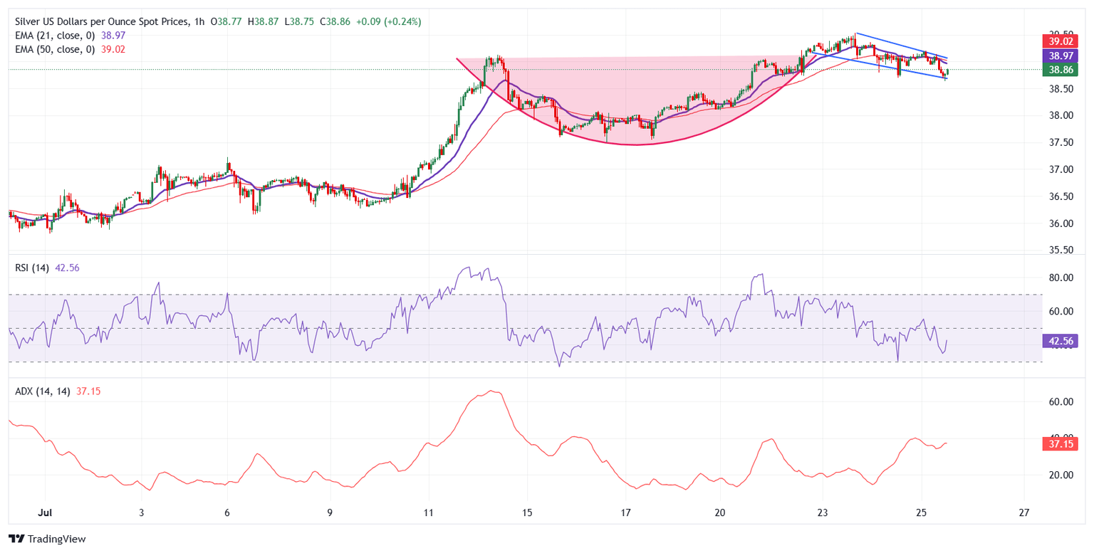 El gráfico horario muestra una presión bajista en aumento, a pesar de una configuración alcista anterior. La Plata recientemente formó una clásica formación de taza con asa, con el asa formándose como un patrón de cuña descendente, lo que generalmente es una señal alcista. Sin embargo, el intento de ruptura por encima de la marca de 39.00$ careció de continuación, y el precio ha caído desde entonces por debajo de la EMA de 21 períodos en 38.96$ y la EMA de 50 períodos en 39.00$. Notablemente, la EMA de 21 períodos ahora ha cruzado por debajo de la EMA de 50 períodos, convirtiendo estos niveles en resistencia inmediata.