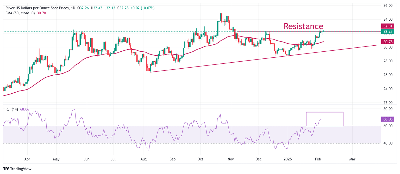 Se espera que el informe NFP de EE.UU. muestre que se añadieron 170.000 nuevos trabajadores a la fuerza laboral en enero, menos que los 256.000 de diciembre. Se estima que la tasa de desempleo se haya mantenido estable en el 4.1%. Los signos de una fuerte demanda laboral aumentarían las expectativas del mercado de que la Fed mantendrá las tasas de interés en su rango actual de 4.25%-4.50% por más tiempo. Tal escenario sería desfavorable para el precio de la Plata.