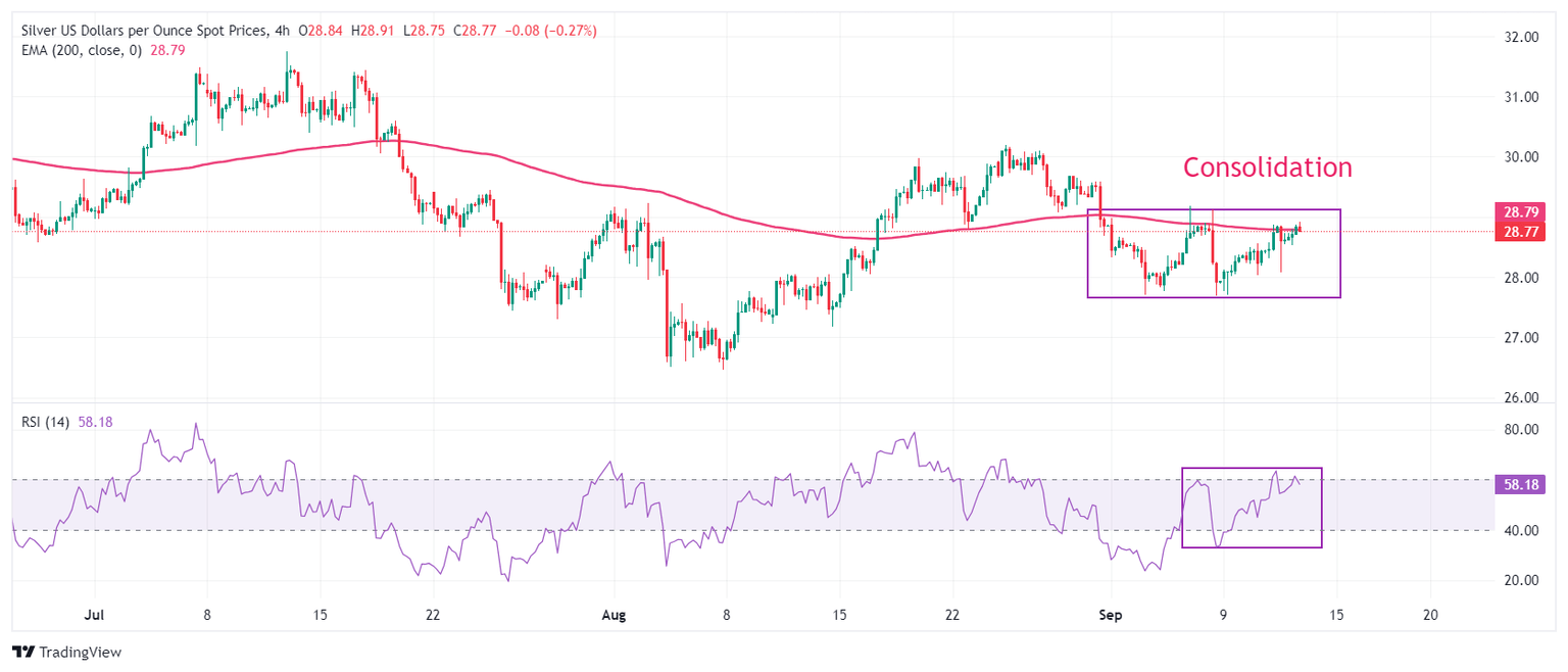 El precio de la Plata se negocia en un rango limitado de 27,70$-29,20$ desde hace más de una semana. El alza en el metal blanco sigue estando limitada por la media móvil exponencial (EMA) de 200 períodos, que se negocia alrededor de 28,80$.
