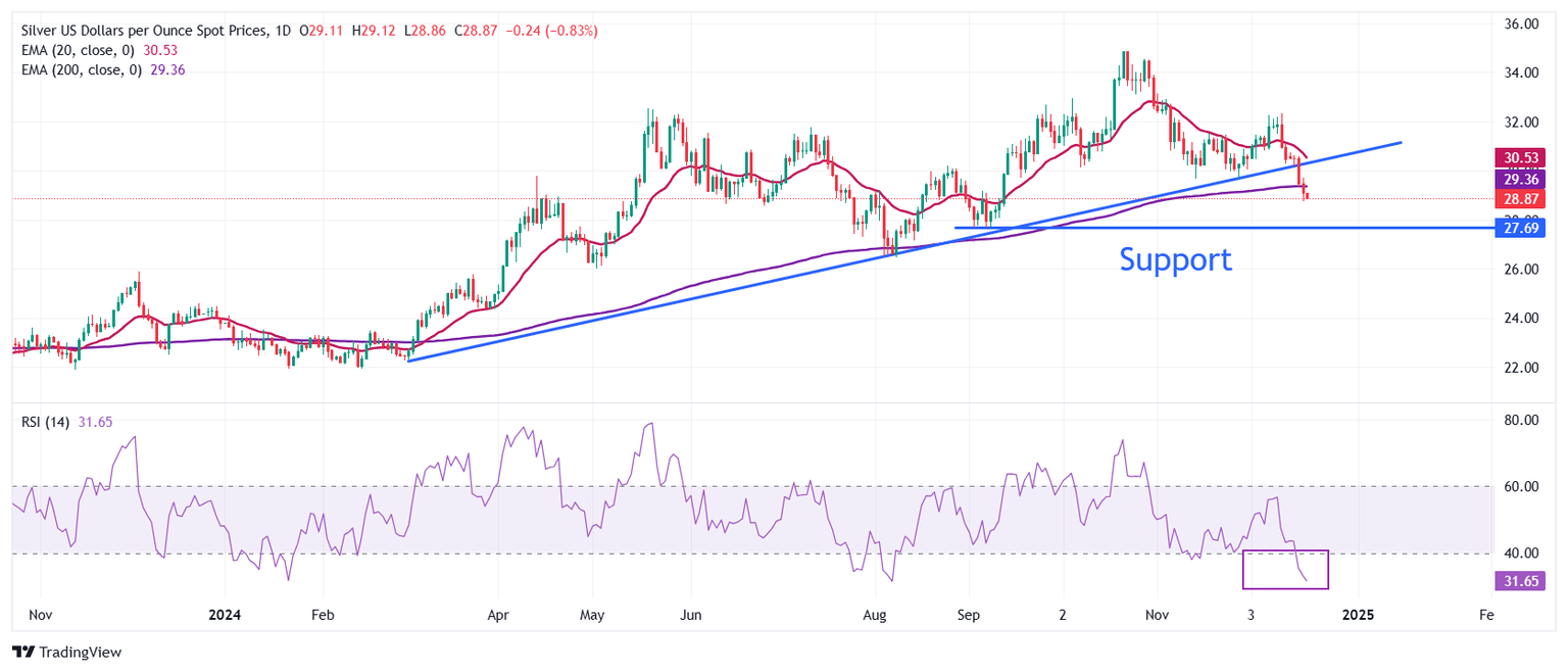 El precio de la plata cae por debajo de la media móvil exponencial (EMA) de 200 días, que cotiza alrededor de 29,35 $. El metal blanco se debilita tras una ruptura de la línea de tendencia ascendente alrededor de 30,20 $, que se traza desde el mínimo del 29 de febrero de 22,30 $.