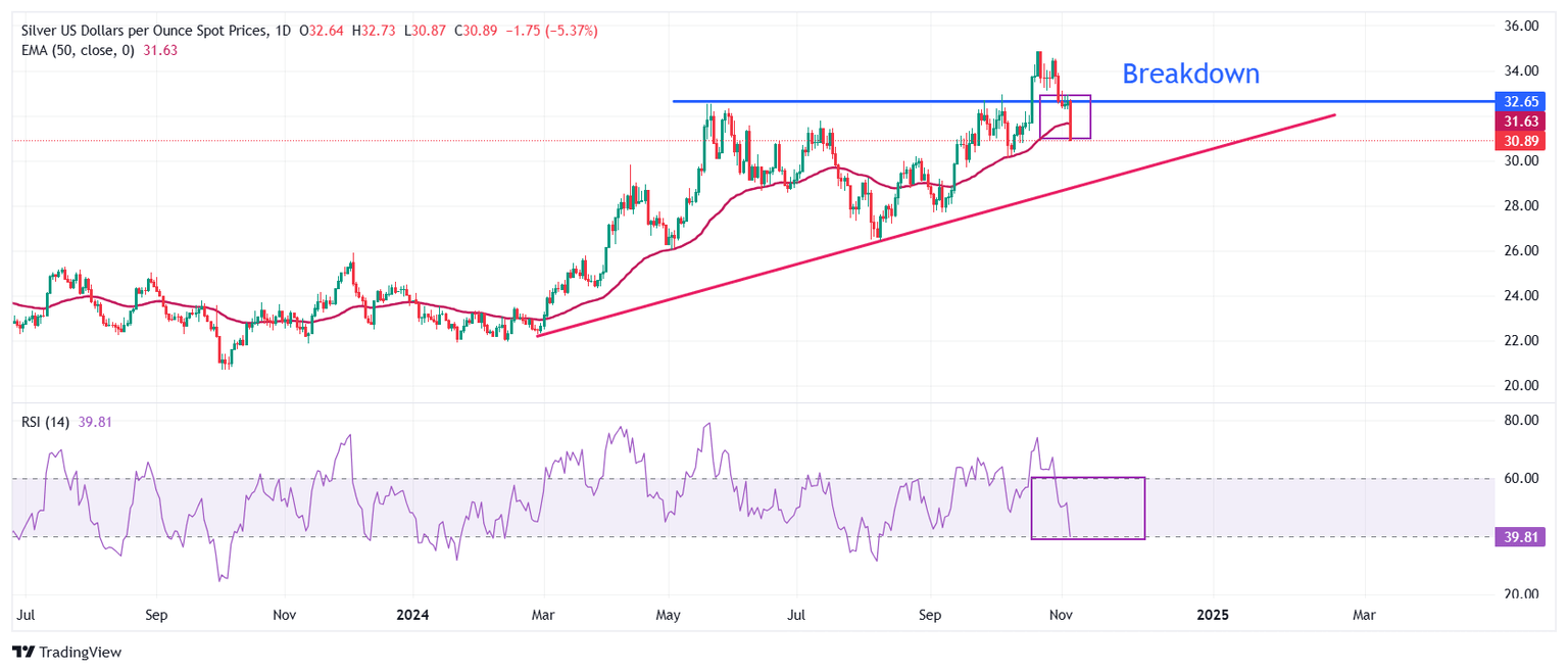 Plata Análisis del Precio: El XAG/USD se desploma hasta cerca de 31.00$ tras la victoria de Trump, foco en la política de la Fed