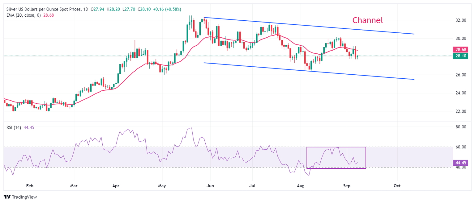 El precio de la Plata se negocia en una formación de canal en un marco de tiempo diario, que está ligeramente inclinado hacia abajo. El activo se recupera bruscamente e intenta romper por encima de la media móvil exponencial (EMA) de 20 días, que cotiza alrededor de 28.68$.