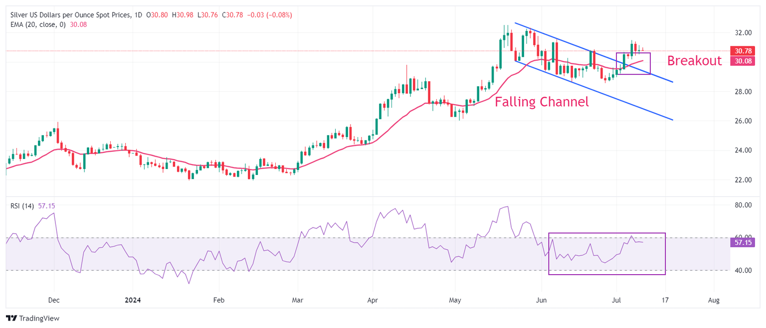 El precio de la plata extiende su alza hasta cerca de 31,00 $ después de una ruptura de la formación de canal descendente en un marco temporal de cuatro horas. Una ruptura al alza del patrón de gráfico mencionado resulta en una reversión alcista. La media móvil exponencial (EMA) de 20 días con pendiente ascendente en 30,70 $, exhibe una tendencia alcista.