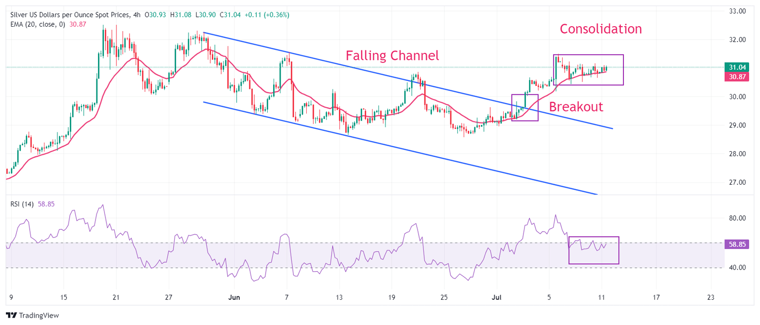 El precio de la Plata (XAG/USD) se consolida en un rango estrecho durante las últimas cuatro sesiones de negociación. El alza en el precio de la Plata sigue limitada a alrededor de 31.00$ mientras los inversores esperan los datos del Índice de Precios al Consumidor (IPC) de Estados Unidos (EE.UU.) para junio, que se publicarán a las 12:30 GMT.