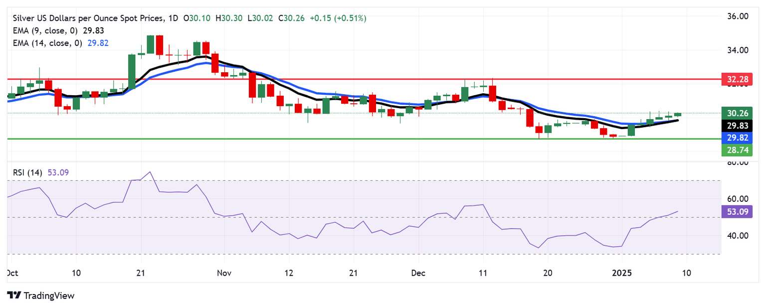 Plata Análisis del Precio: El XAG/USD sube por encima de 30.00$, avanza a lo largo de la EMA de nueve días