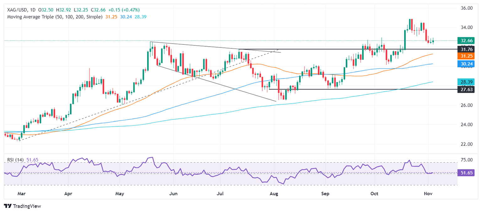 Si el XAG/USD supera la marca de 33.00$, la siguiente parada sería el máximo de la vela bajista del 31 de octubre en 33.89$. Lo siguiente es la cifra de 34.00$, que, si se supera, los alcistas pueden volver a probar el pico del año hasta la fecha (YTD) en 34.86$.