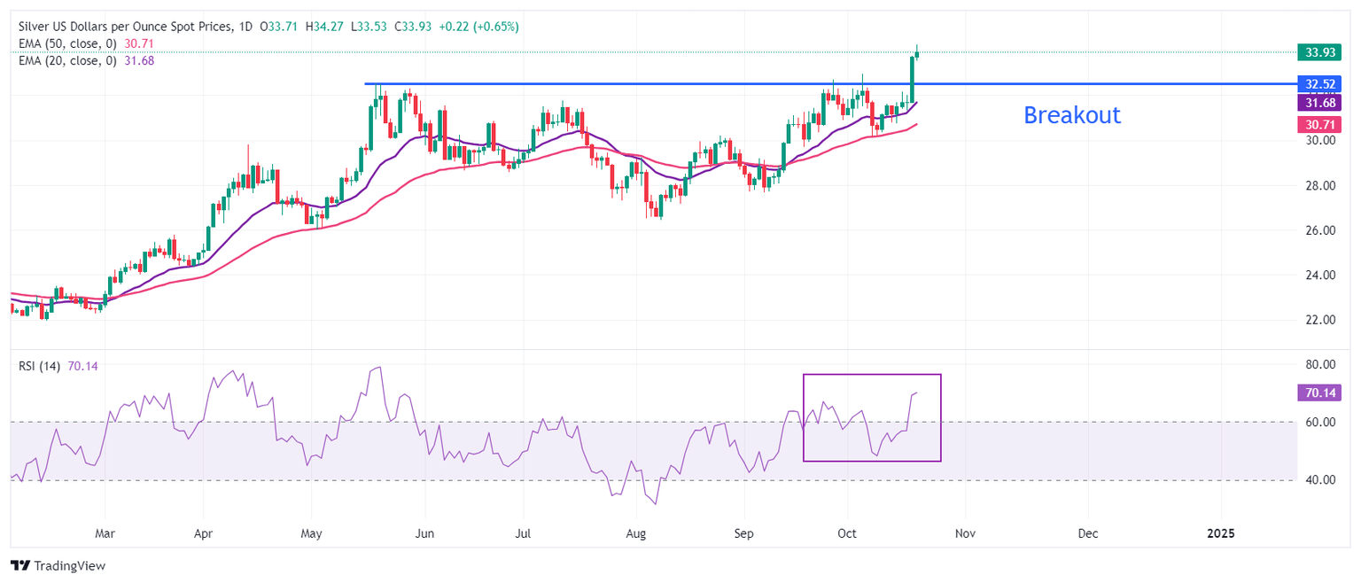 Plata Análisis del Precio: El XAG/USD sube por encima de 34.00$ debido a los riesgos en Oriente Medio y la incertidumbre electoral en EE.UU.