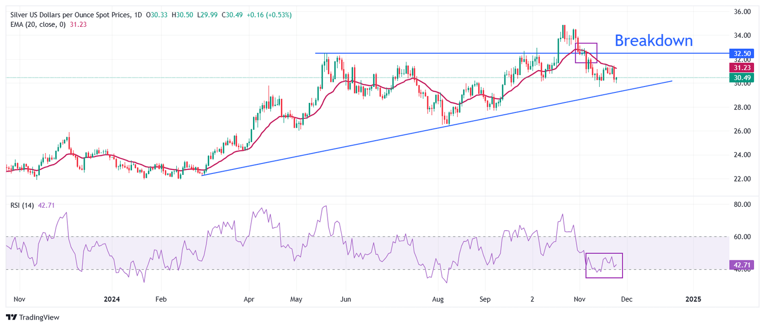 El precio de la Plata reanuda su tendencia descendente después de un movimiento de reversión media cerca de la media móvil exponencial (EMA) de 20 días alrededor de 31.40$. Se espera que el metal blanco retroceda al mínimo del 14 de noviembre alrededor de 29.70$. El metal blanco se debilitó después de la ruptura del soporte horizontal trazado desde el máximo del 21 de mayo de 32.50$.