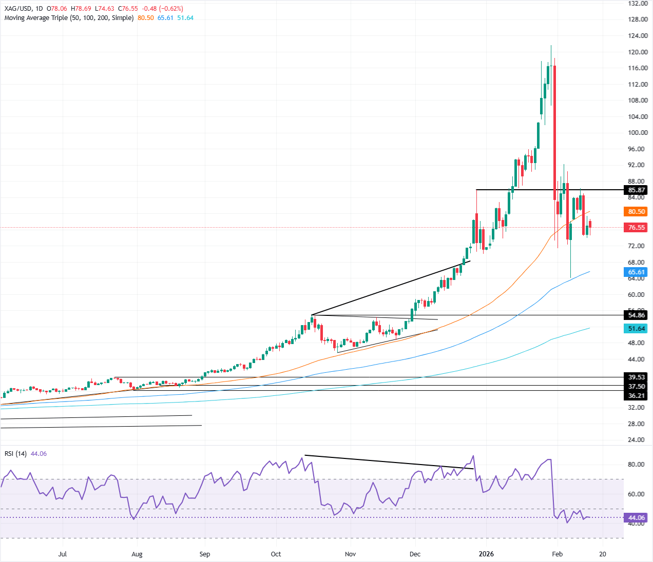 - La envolvente bajista mantiene al XAG/USD atrapado dentro del rango de consolidación de 75.00$–80.00$.
