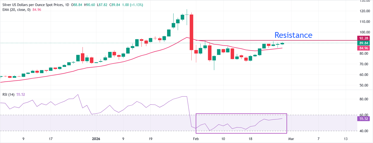 XAG/USD cotiza al alza por encima de 90$ al momento de escribir. El sesgo a corto plazo se inclina ligeramente alcista ya que el precio se mantiene por encima de la media móvil exponencial (EMA) de 20 días, que está alrededor de 85$ y respalda el reciente rebote desde el área de mediados de 70$. La secuencia de mínimos más altos desde 73.64$ hasta la actual consolidación apoya una estructura de recuperación en lugar de una continuación de la fuerte caída anterior desde por encima de 110$.