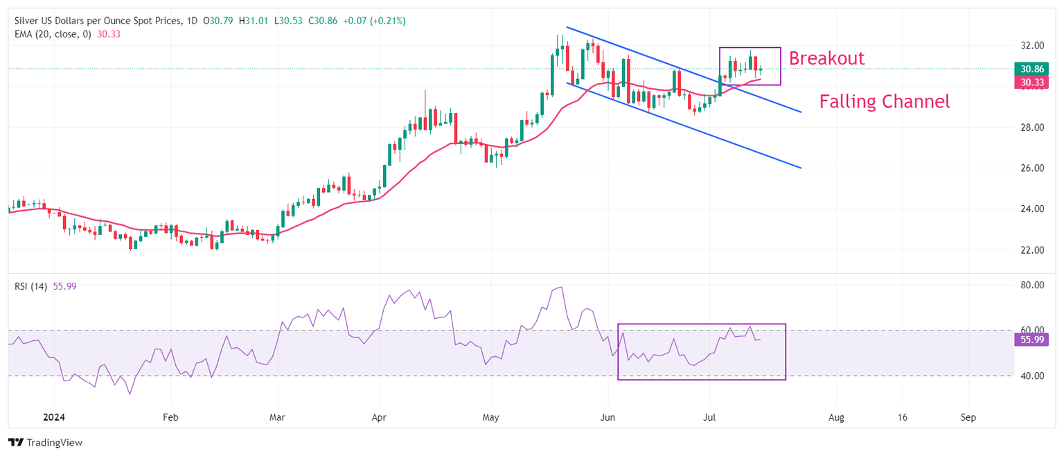El precio de la Plata mantiene la ruptura de la formación de gráfico de canal descendente en un marco temporal diario. La media móvil exponencial (EMA) de 20 períodos en ascenso cerca de 30,30$ sigue proporcionando soporte a los alcistas del precio de la Plata.