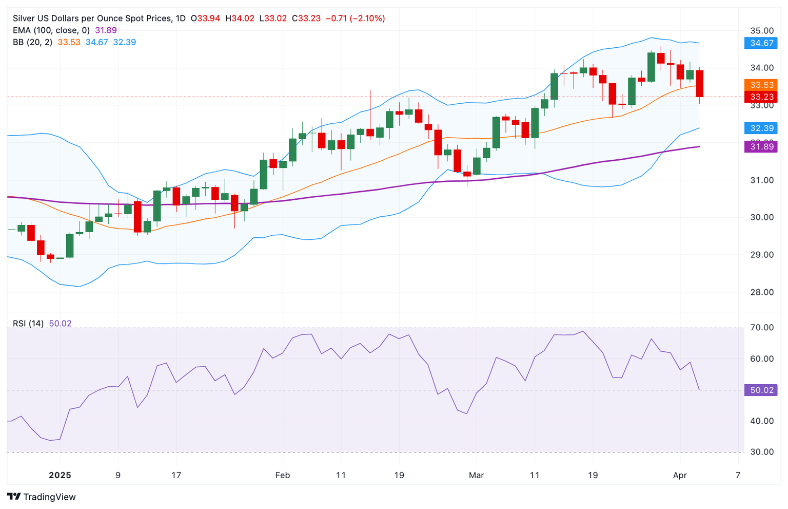 El precio de la Plata (XAG/USD) cae a cerca de 33.15$ durante la sesión europea del jueves, presionado por algunas tomas de beneficios. No obstante, la caída para el metal blanco podría estar limitada ya que el presidente de EE.UU., Donald Trump, anunció nuevos aranceles globales el miércoles, aumentando los temores de una guerra comercial en expansión.