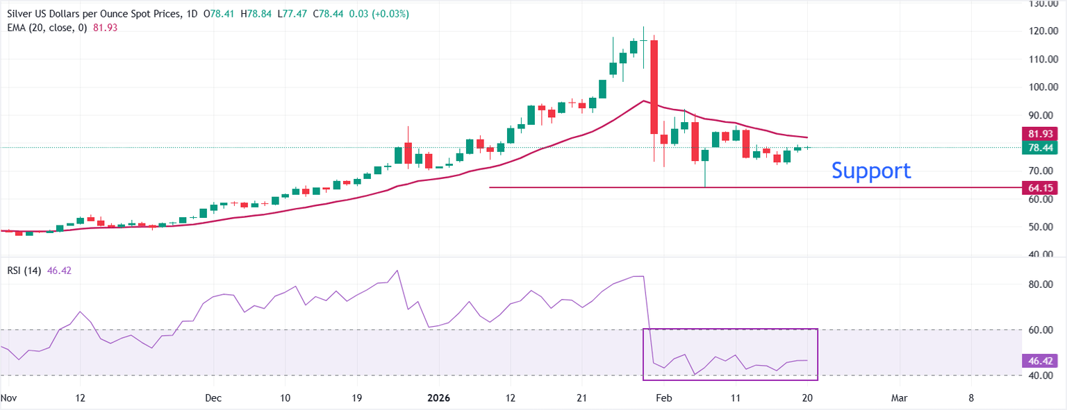 En el gráfico diario, el XAG/USD cotiza plano alrededor de 78.44$. El precio se mantiene por debajo de una media móvil exponencial (EMA) de 20 días en 81.93$, manteniendo la presión a la baja. La EMA de 20 días ha girado en las sesiones recientes y continúa limitando los intentos de recuperación.