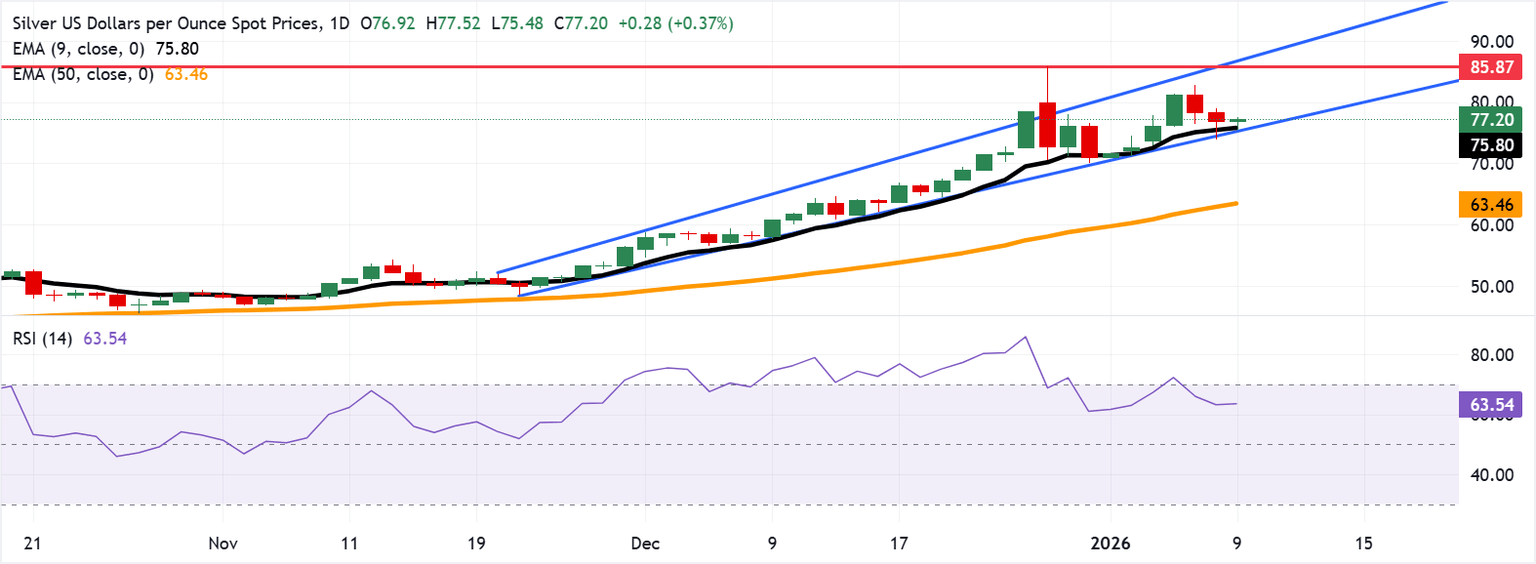El precio de la Plata (XAG/USD) gana terreno tras dos días de pérdidas, cotizando alrededor de 77.20$ por onza troy durante las horas asiáticas del viernes. El análisis técnico del marco de tiempo del gráfico diario sugiere que el precio del metal precioso permanece dentro de un patrón de canal ascendente, indicando un sesgo alcista sostenido.