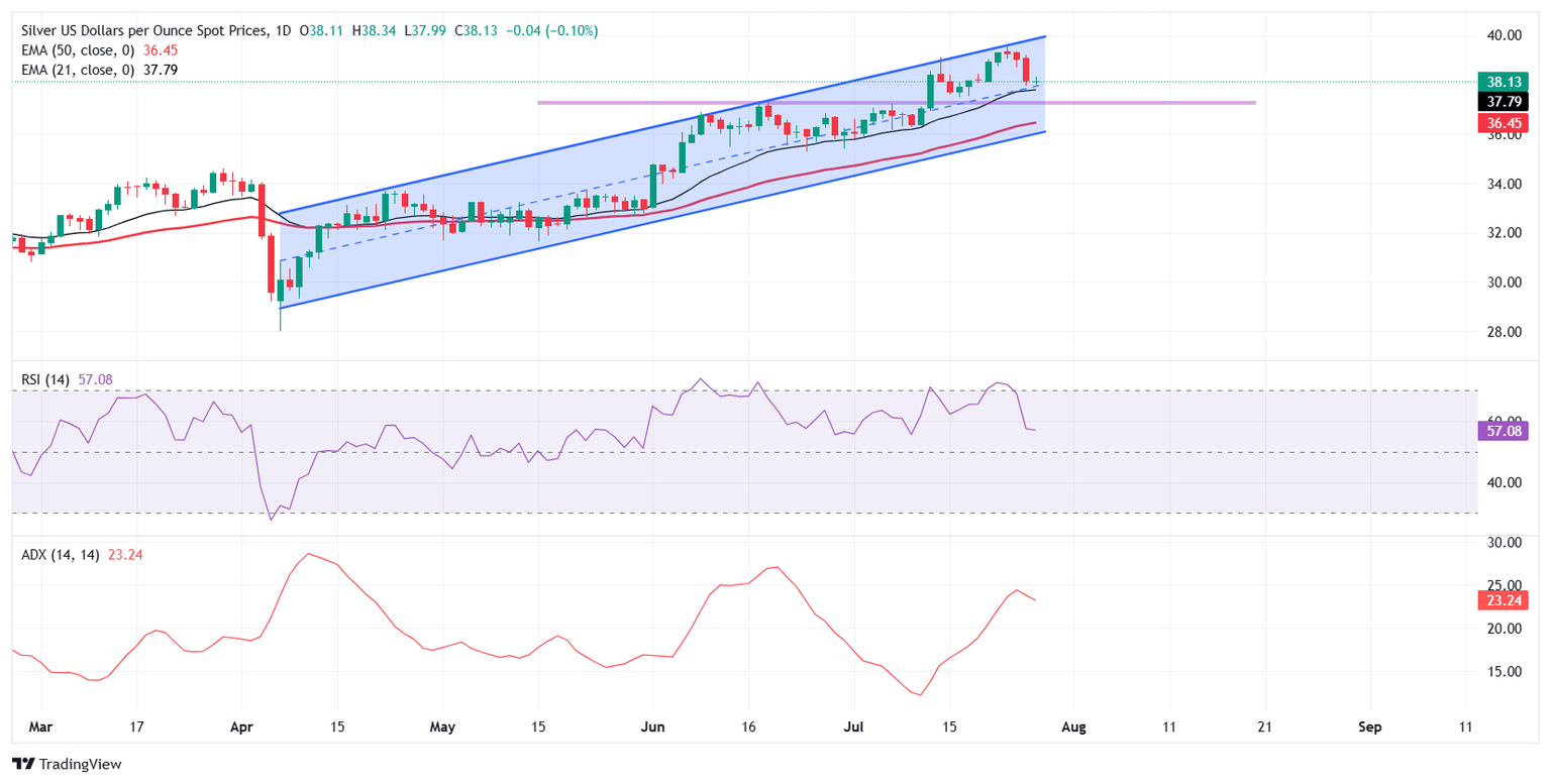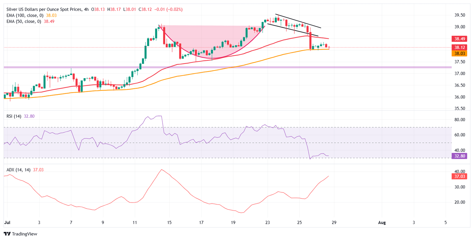 La Plata (XAG/USD) se mantiene estable cerca de 38.00$ el lunes, luchando por recuperar impulso tras el quiebre técnico de la semana pasada. Aunque los precios se mantienen estables en el día, el sentimiento del mercado más amplio está pesando sobre el metal. Con el optimismo comercial global en aumento, particularmente el acuerdo comercial entre EE.UU. y la UE, los inversores están cambiando su enfoque hacia activos de riesgo y alejándose de los refugios seguros tradicionales, como la Plata.