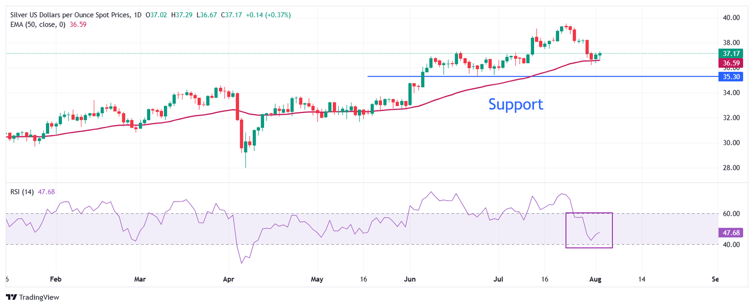 El precio de la Plata encuentra soporte tras corregir hasta cerca de la media móvil exponencial (EMA) de 50 días alrededor de los 36.60$.
