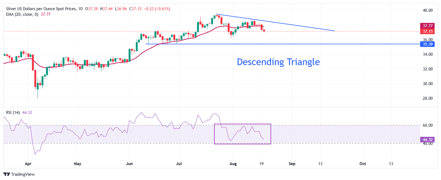El precio de la Plata se desploma a cerca de 37.00$ el miércoles. El metal blanco demuestra una fuerte contracción en la volatilidad debido a la formación del Triángulo Descendente en un marco de tiempo diario. El soporte horizontal del patrón gráfico mencionado se traza desde el mínimo del 7 de julio alrededor de 36.16$, mientras que el borde descendente se coloca desde el máximo del 23 de julio cerca de 39.53$.