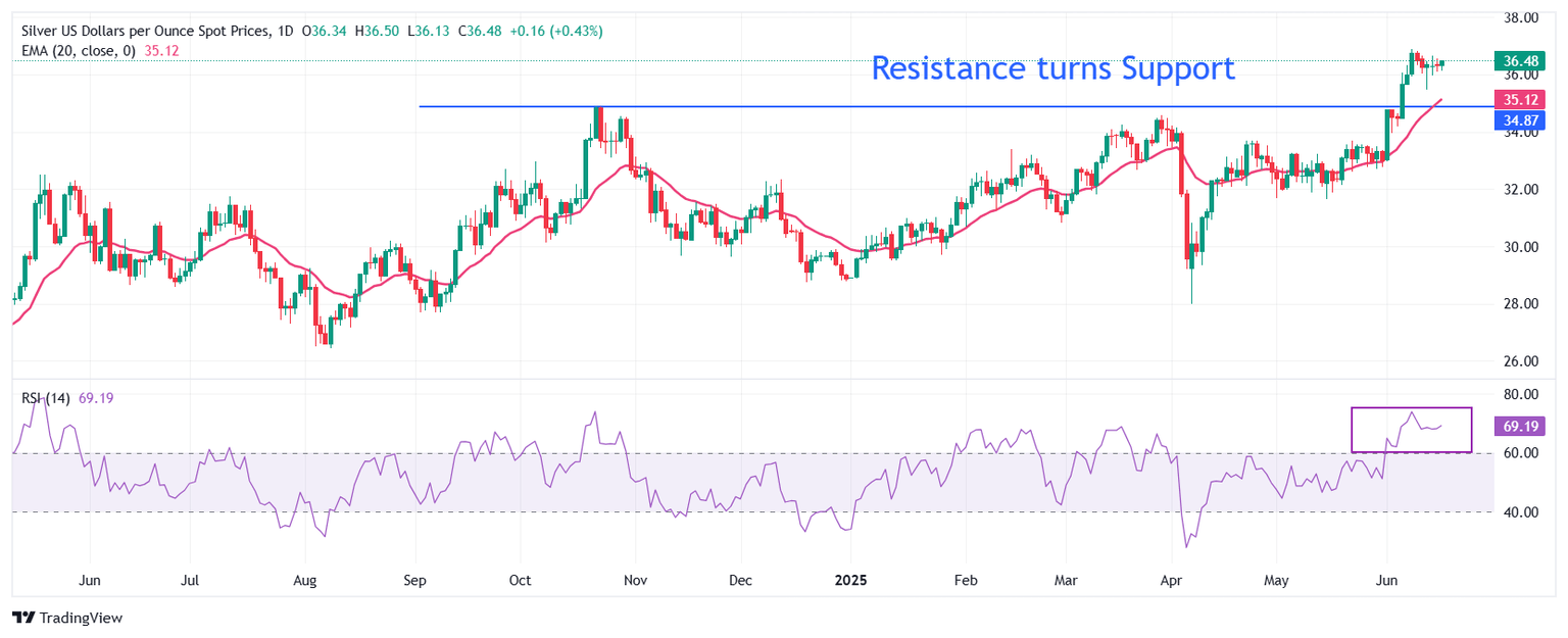 El precio de la Plata (XAG/USD) se mueve al alza hasta cerca de 36.50$ durante las horas de negociación europeas del martes. El metal blanco se negocia firmemente a medida que la guerra aérea entre Israel e Irán ha aumentado la demanda de activos de refugio seguro, como la Plata.
