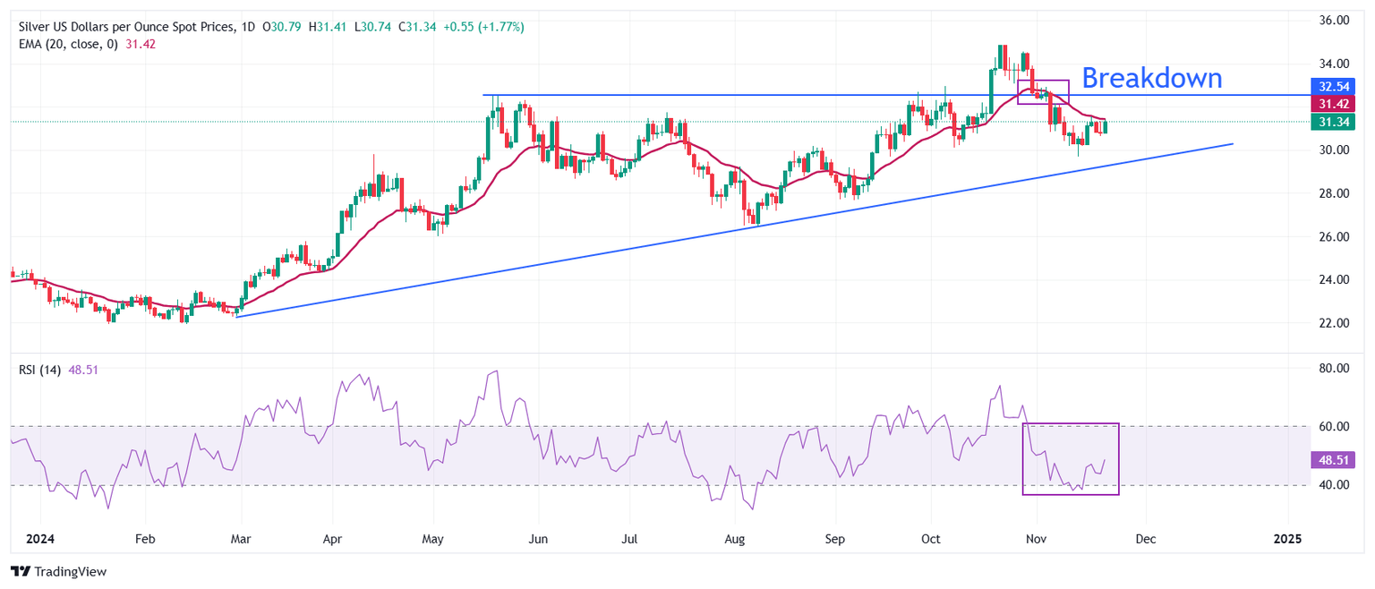 La línea de tendencia ascendente desde el mínimo del 29 de febrero de 22,30 $ actuará como soporte clave para el precio de la plata alrededor de 29,50 $.