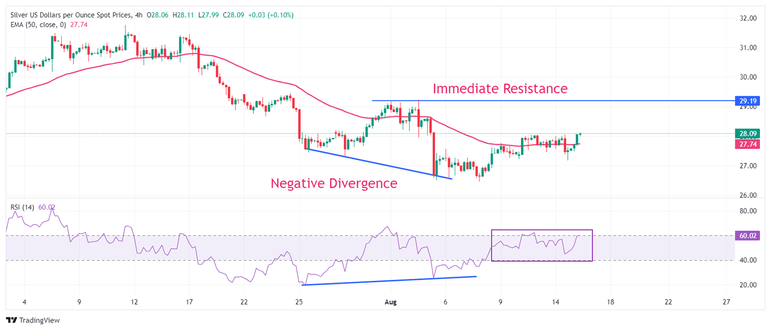 El precio de la Plata rebota después de una formación de divergencia negativa en un marco temporal de cuatro horas, que se forma cuando el oscilador de momento se niega a hacer mínimos más bajos, mientras el activo continúa. El Índice de Fuerza Relativa (RSI) de 14 períodos rebotó desde 24.00 sin caer por debajo del mínimo anterior de 20.00.
