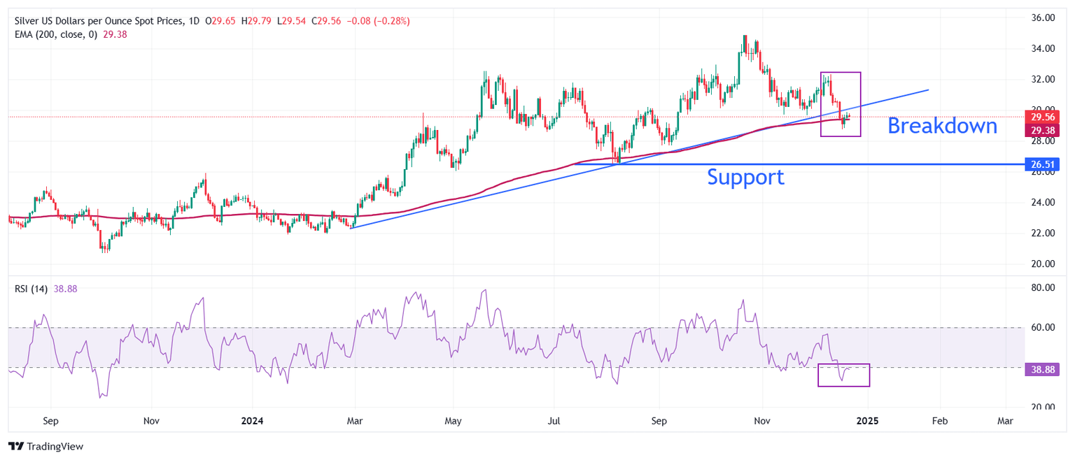- El precio de la Plata se mantiene ampliamente débil en medio de una ruptura de la línea de tendencia ascendente.