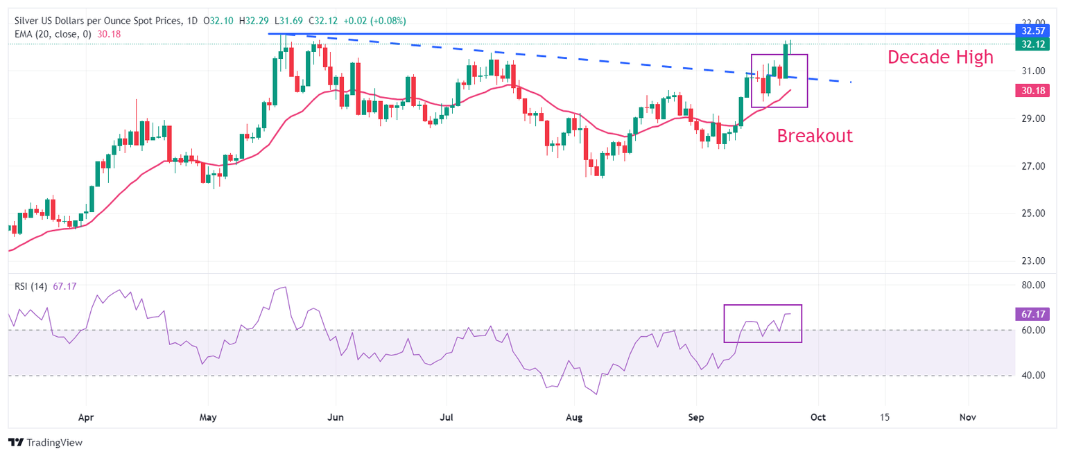 El precio de la Plata (XAG/USD) se mantiene cerca de la resistencia clave de 32.00$ en la sesión de Nueva York del miércoles. El metal blanco mantiene su fortaleza ya que el Dólar estadounidense sigue bajo presión en medio de la creciente especulación de que la Reserva Federal (Fed) realizará otro considerable recorte de tasas de interés en alguna de las dos reuniones de política monetaria restantes de este año.