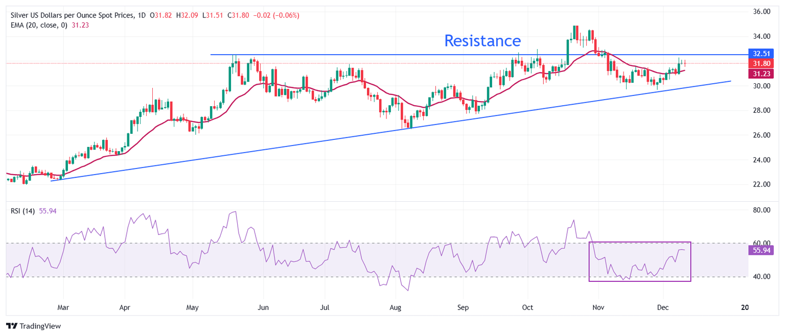 El precio de la plata se consolida alrededor de 31.50$. El metal blanco se disparó al inicio de la semana hasta cerca de 32.30$ después de romper por encima de la resistencia de tres días de 31.30$. El activo sube por encima de la media móvil exponencial (EMA) de 20 días cerca de 31.20$, lo que sugiere que la tendencia a corto plazo se ha vuelto alcista.