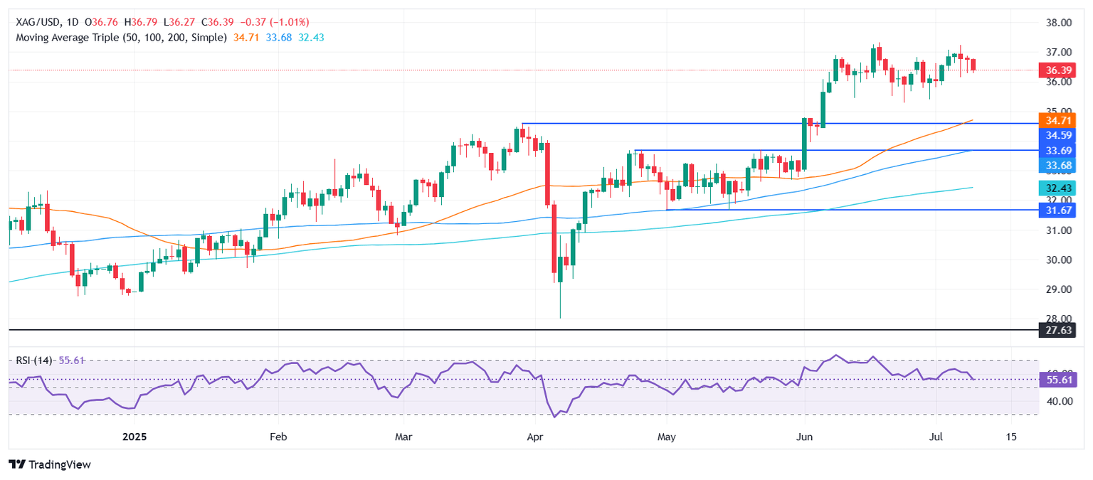 Desde una perspectiva técnica, la consolidación es la clave, con el XAG/USD oscilando entre 36.00$ y 37.00$ durante los últimos cinco días de negociación, moviéndose alrededor de la media móvil simple (SMA) de 20 días en 36.37$.