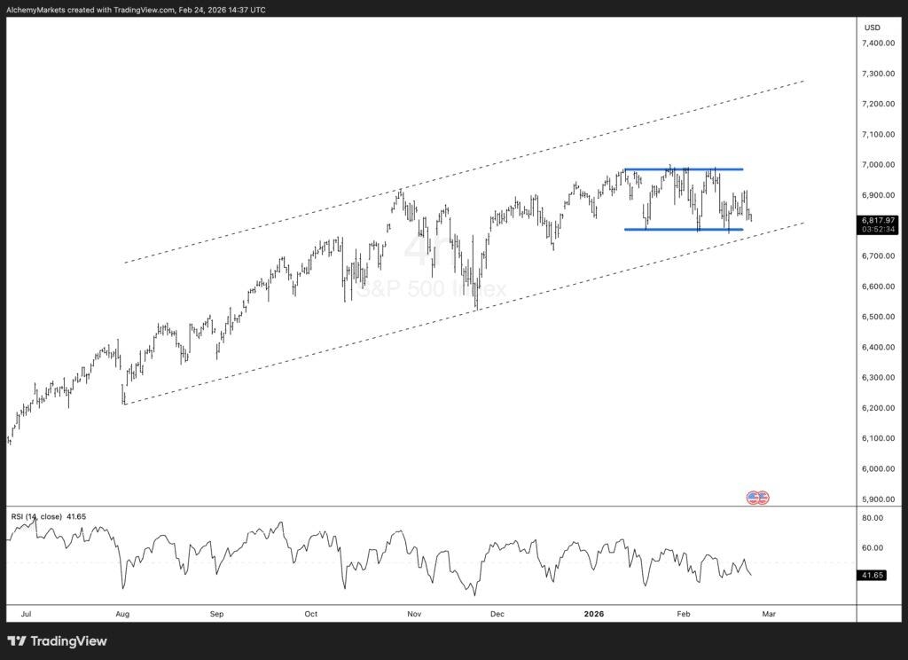 De hecho, los mercados a menudo intentan un empuje más alto antes de que se desarrolle un cambio de tendencia más grande. Un rebote desde esta zona de soporte podría enviar al SPX de regreso hacia los máximos del rango cerca de 7.000. Si ese repunte falla, entonces podemos cuestionar si la tendencia más amplia se está agotando.