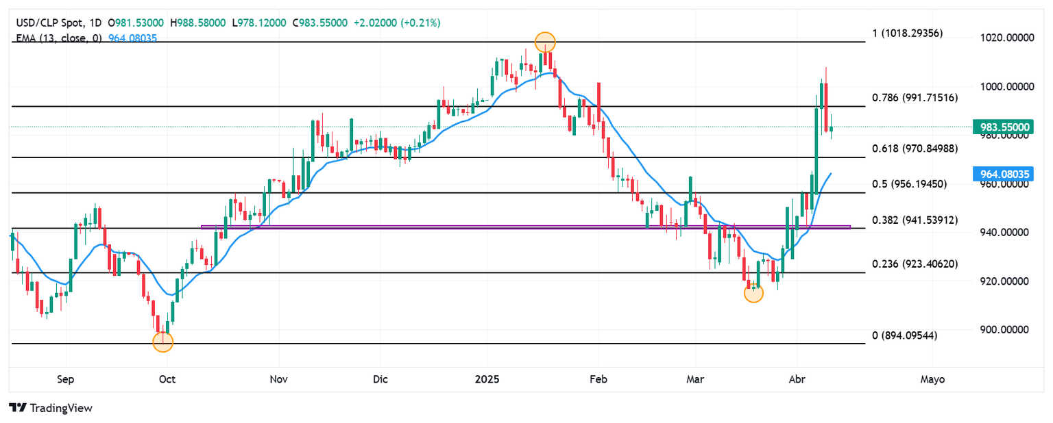 En este escenario, el Peso chileno reacciona a la baja desde máximos del 7 de abril, en tanto que el USD/CLP gana un 0.22% el día de hoy, consolidándose dentro del rango operativo de la sesión previa en 983.53.