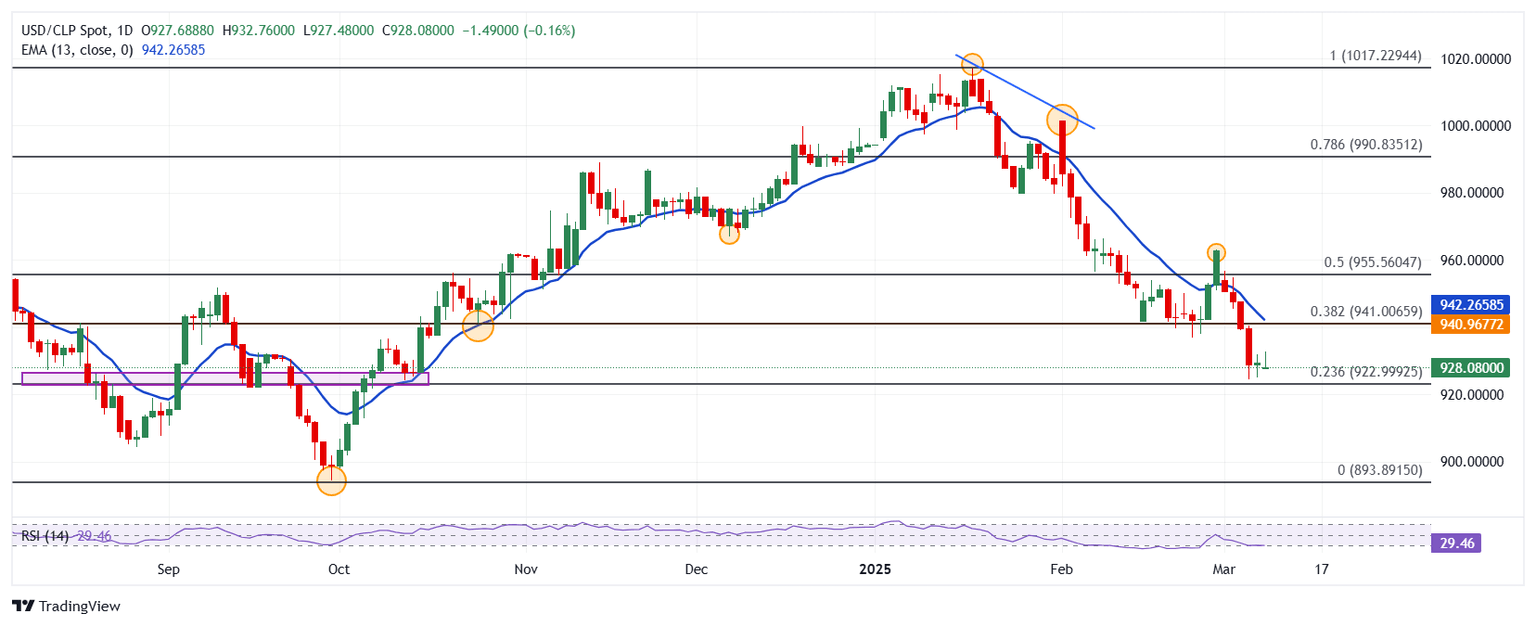 En medio de un contexto en el que la retórica arancelaria de Donald Trump ocupa el centro del escenario, el Peso chileno opera cerca de máximos no vistos desde octubre del 2024. A la par, el USD/CLP se negocia actualmente en 928.66, perdiendo un 0.09% el día de hoy, retomando la perspectiva bajista con intenciones de explorar precios inferiores al soporte del 6 de marzo en 924.55.