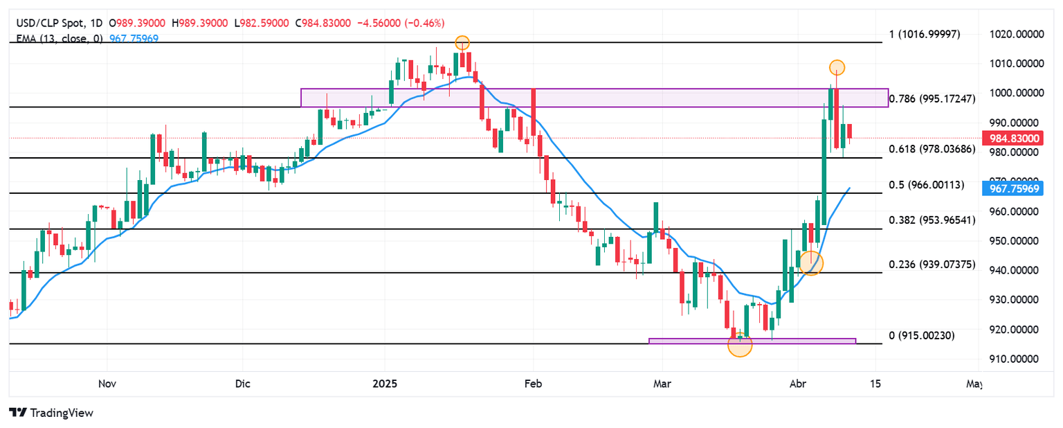 El USD/CLP reaccionó a la baja desde una resistencia de corto plazo dado por el máximo del 9 de abril en 1.007,73. La siguiente resistencia clave la observamos en 1.017,05, máximo del 17 de enero. A la baja, la zona clave de soporte se encuentra en 915.57, punto pivote del 19 marzo.