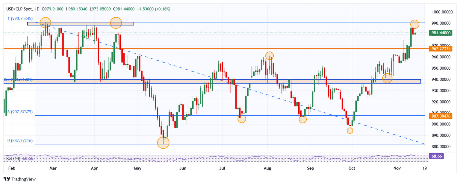 El USD/CLP marcó un mínimo del día en 974.55, donde encontró compradores que impulsaron el cruce a un máximo de casi siete meses en 989.15. Actualmente, el USD/CLP opera en 983.78, ganando un 0.40% diario.