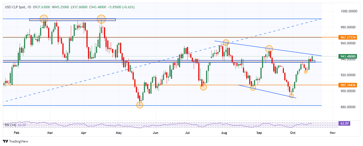El USD/CLP marcó un mínimo del día en 937.60, atrayendo compradores agresivos que llevaron el cruce a un máximo diario en 945.10. Actualmente, el Dólar estadounidense cotiza sobre 942.83 frente al Peso chileno, ganando un 0.56% el día de hoy.