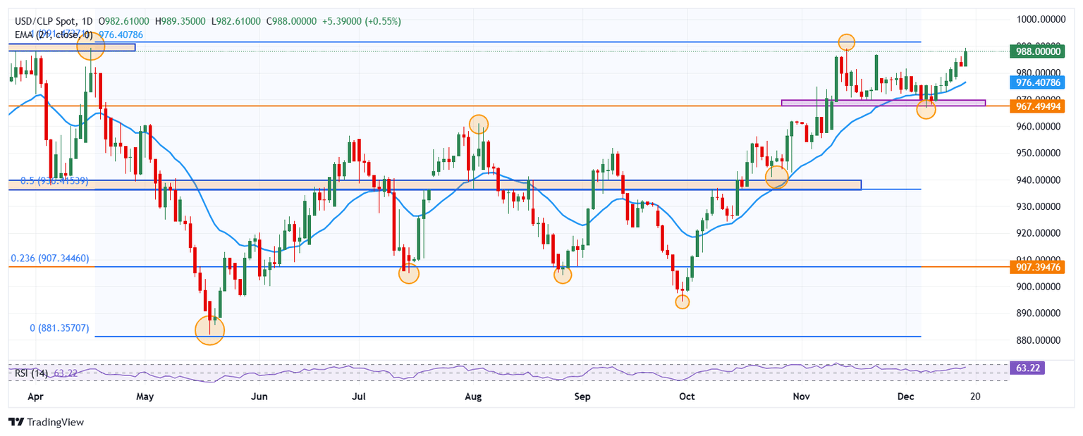 El USD/CLP registró un diario en 982.61, encontrando compradores agresivos que llevaron la paridad a un máximo de casi cinco semanas no visto desde el 14 de noviembre en 989.10. Al momento de escribir, el USD/CLP cotiza en 988.52, subiendo un 0.61% en la jornada del miércoles.