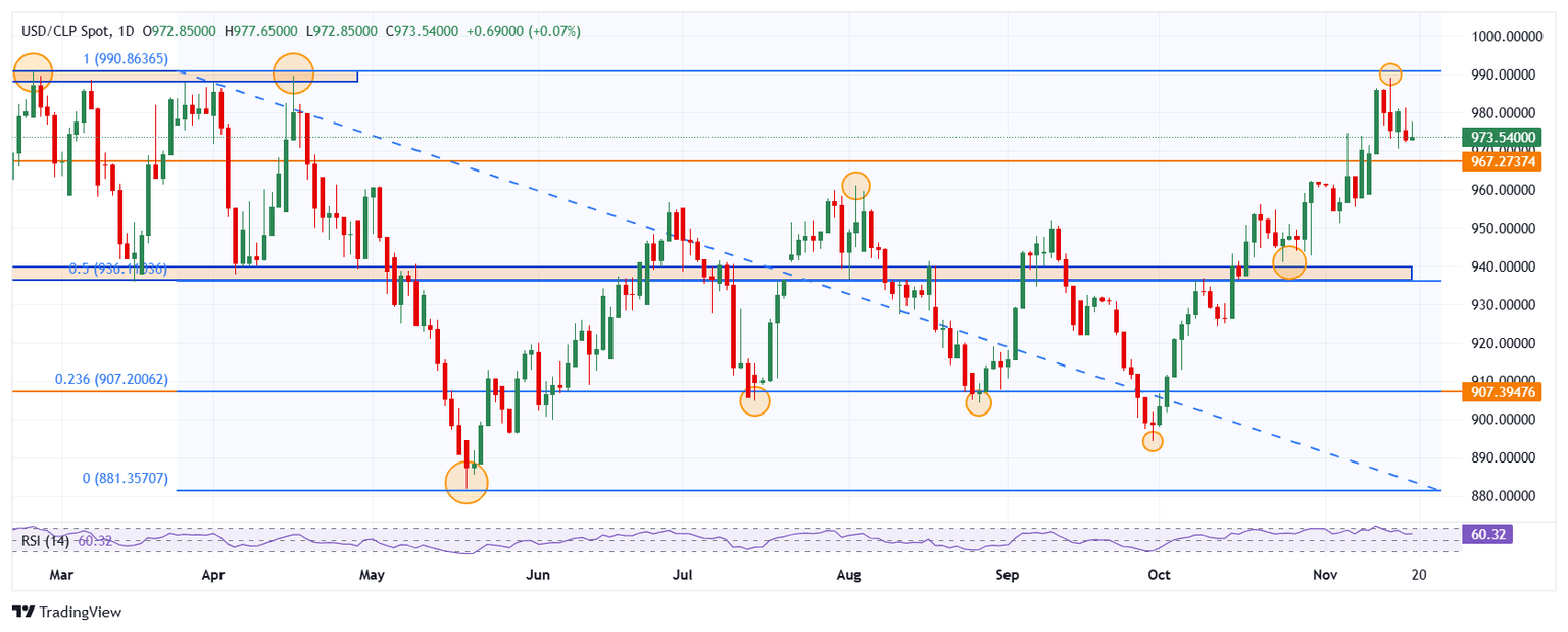 El USD/CLP estableció un mínimo diario en 972.85, donde atrajo compradores que llevaron el cruce a un máximo del día en 977.65. Al momento de escribir, el USD/CLP cotiza sobre 973.75, ganando un 0.09% en el día.