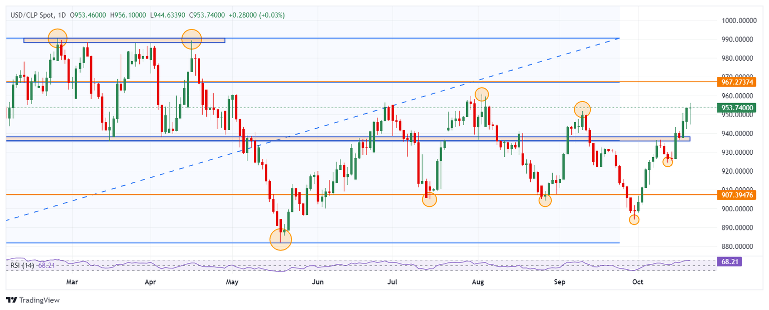El USD/CLP marcó un mínimo de la sesión en 944.63, donde atrajo compradores que llevaron la paridad a un máximo de 11 semanas no visto desde el 5 de agosto en 956.10. Actualmente, el Dólar estadounidense cotiza en 953.88 frente al Peso chileno, ganando un 0.06% el día de hoy.