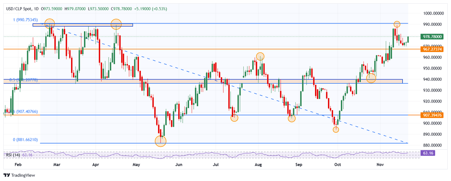 El USD/CLP marcó un mínimo del día en 973.50, encontrando compradores agresivos que llevaron el cruce a máximos del 18 de noviembre en 979.07. Actualmente, el USD/CLP cotiza sobre 978.29, ganando un 0.49% diario.
