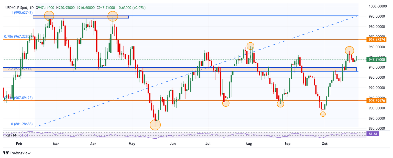 El USD/CLP marcó un mínimo diario en 946.60, atrayendo compradores que llevaron el cruce a un máximo diario en 950.95. Actualmente, el Dólar estadounidense cotiza en 947.66 frente al Peso chileno, subiendo un 0.7% el día de hoy.