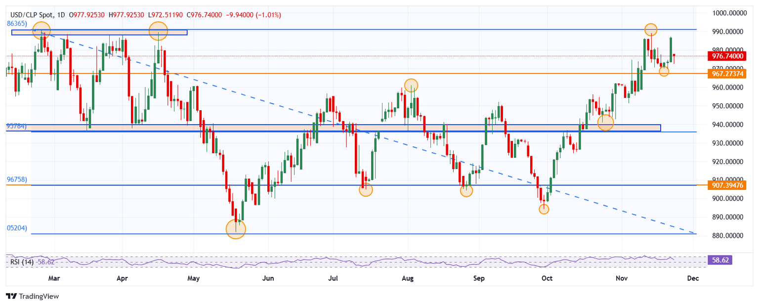 El USD/CLP estableció un máximo del día en 977.92, donde atrajo vendedores agresivos que llevaron el cruce a mínimos del 21 de noviembre en 972.51. Al momento de escribir, el USD/CLP opera en 973.59, cayendo un 1.36% diario.