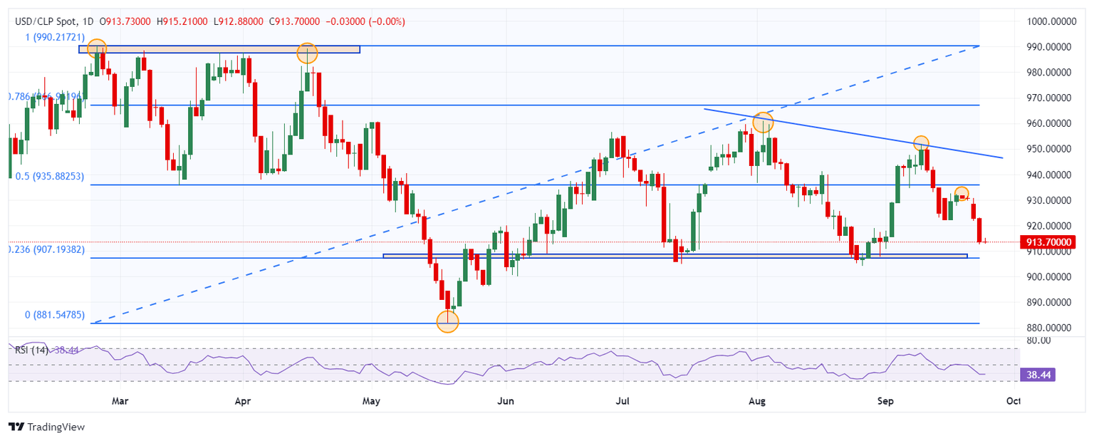 El USD/CLP marcó un máximo de la sesión en 915.21, atrayendo vendedores agresivos que llevaron la paridad a un mínimo del día en 912.99. Al momento de escribir, el Dólar estadounidense opera en 913.15 frente al Peso chileno, cayendo un 0.07% diario.