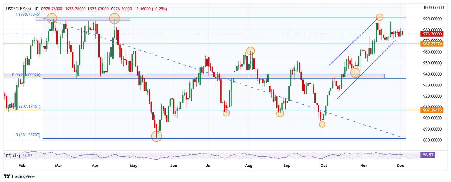 El USD/CLP marcó un máximo diario en 97 8.76, encontrando vendedores que arrastraron el cruce a un mínimo del día en 97 5.03. Actualmente, el USD/CLP opera sobre 975.53, cayendo un 0.33% en la jornada del martes.